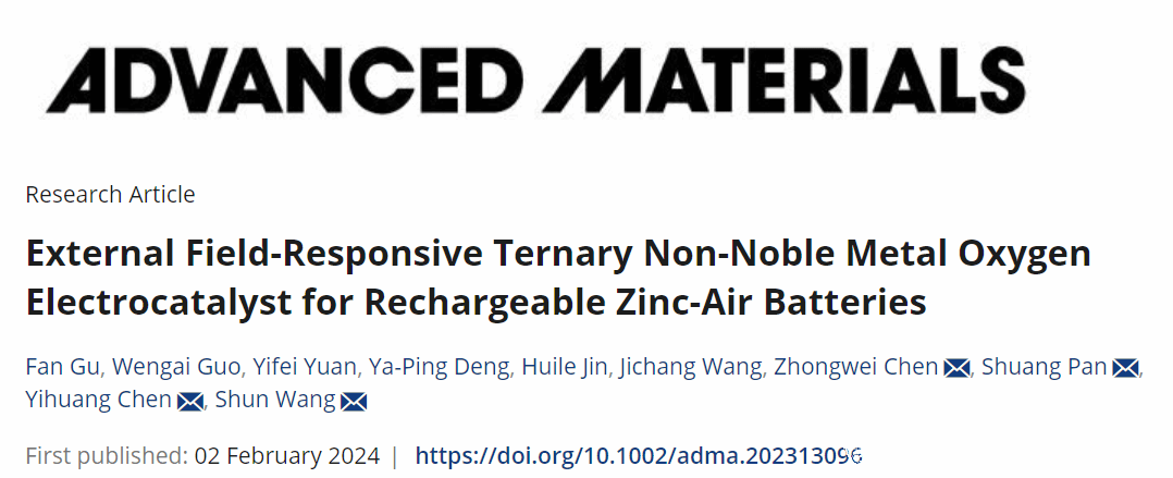 该成果以“External Field-Responsive Ternary Non-Noble Metal Oxygen Electrocatalyst for Rechargeable Zinc-Air Batteries”为题发表在Advanced Materials期刊(IF=29.4,SCI一区)上。beat365官方网站为第一通讯单位,化材学院研究生顾凡、郭文改为共同第一作者,加拿大滑铁卢大学陈忠伟院士、beat365潘霜副教授、陈亦皇教授和王舜教授为共同通讯作者。该工作受到中国自然科学基金(No. 52331009、62104170和22109120)、浙江省自然科学基金(LY23F040001和LQ21B030002)的资助。