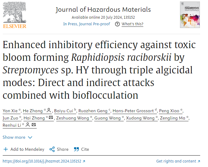 近日,beat365官方网站生命与环境科学学院李仁辉教授团队的张和博士和硕士研究生谢艳(已毕业)等在国际著名期刊《Journal of Hazardous Materials》(中科院一区,环境科学与生态学领域顶刊)上发表题为“Enhanced inhibitory efficiency against toxic bloom forming Raphidiopsis raciborskii by Streptomyces sp. HY through triple algicidal modes: Direct and indirect attacks combined with bioflocculation”的论文。