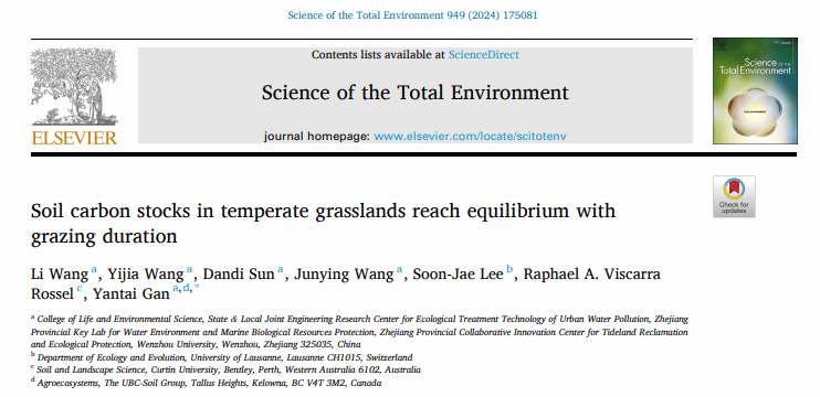 近日,beat365官方网站生环学院甘延太教授团队在环境科学领域Top期刊《Science of the Total Environment》(中科院SCI期刊分区一区,IF 8.2)在线发表了题为“Soil carbon stocks in temperate grasslands reach equilibrium with grazing duration”的论文。