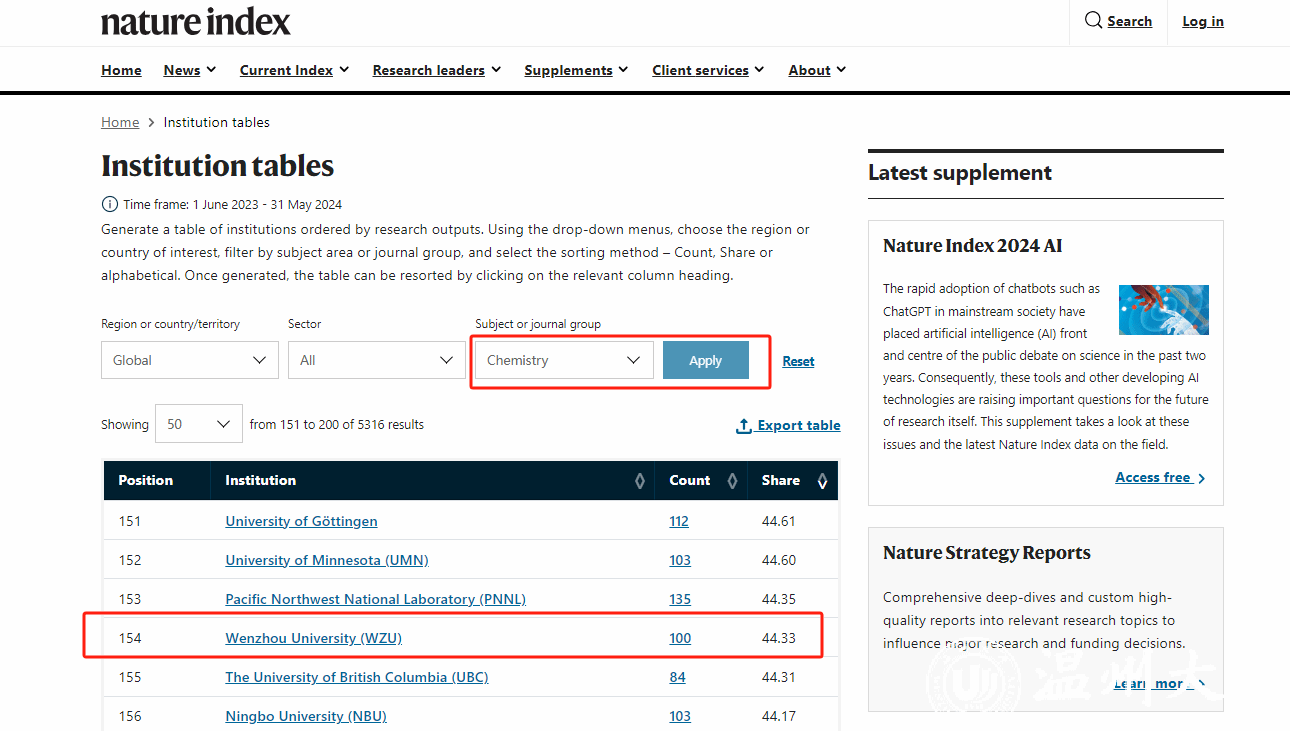 近日,自然指数官网更新了最新的自然指数排名(统计时间节点为2023.6.1-2024.5.31),beat365化学学科在此次统计周期内排名全国第77位,全球第154位,再创历史新高。