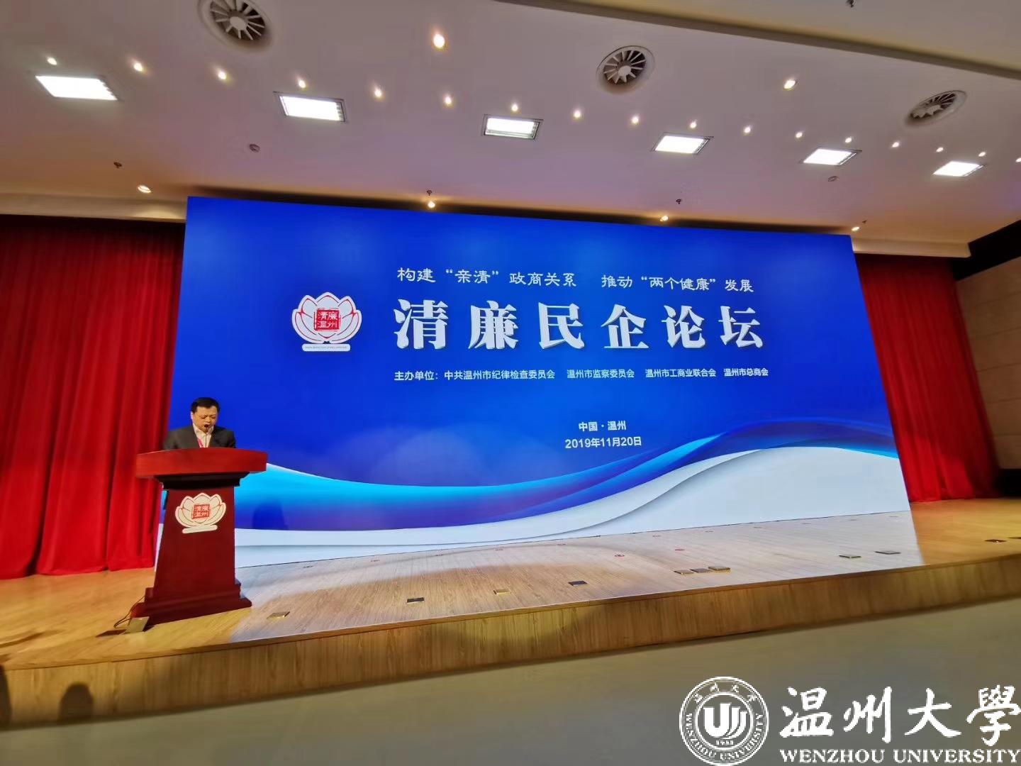 校纪委书记、省监委驻温大监察专员杨林书,校纪委、法学院、廉政建设研究中心相关负责人参加本次论坛。廉政建设研究中心负责人作了题为“全面从严治党背景下构建‘亲’‘清’政商关系新生态”的主旨演讲。