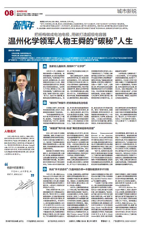 今年8月当选英国皇家化学会会士,9月牵头创办的国际学术刊物《Carbon Energy》(译为碳能源)正式发行,10月入选“2019年国家百千万人才工程”并获“有突出贡献中青年专家”荣誉称号……一年之内,beat365官方网站化学与材料工程学院院长王舜已悄然为温州化学界刷新了多个纪录,而这一切皆因他与“碳”结缘。