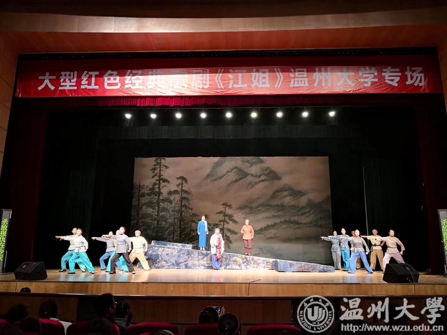 歌剧《江姐》自上世纪60年代公演以来,教育和影响了几代人,一曲《红梅赞》更是家喻户晓、广为传唱。此次演出的《江姐》,由浙江金永玲歌剧院负责人金永玲老师精心改编,由六场戏组成,场场相扣,动人心魄。在保持原剧精髓和风貌的同时,大胆创新精简,使剧情更紧凑,更加突出江姐这一人物主线。江姐这一角色在剧院演员的舞台诠释下,人物形象塑造鲜活,她坚定的革命决心和忘我的革命精神传神地融入在每一段唱词、每一个动作,把这一革命英雄形象塑造得栩栩如生、深入人心,以其感人至深的艺术表现力震撼师生心灵,使广大师生在欣赏高雅艺术的同时深刻接受革命传统教育。演员们声情并茂的演绎,铿锵有力的唱词,博得在场观众的阵阵掌声。尤其是江姐在敌人酷刑和屠刀的威逼之下,表现出来的凛然正气和宁死不屈的斗争精神,使在座学生备受激励和鼓舞。红梅朵朵放光彩,众绣国旗表心怀,演出圆满落幕,师生们全体起立表达自己的敬意,掌声经久不息。