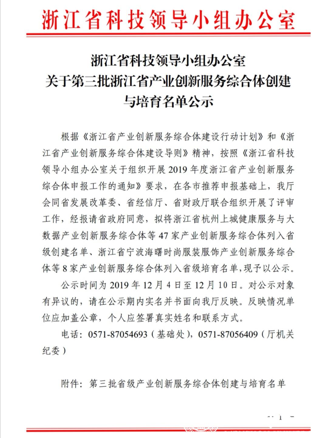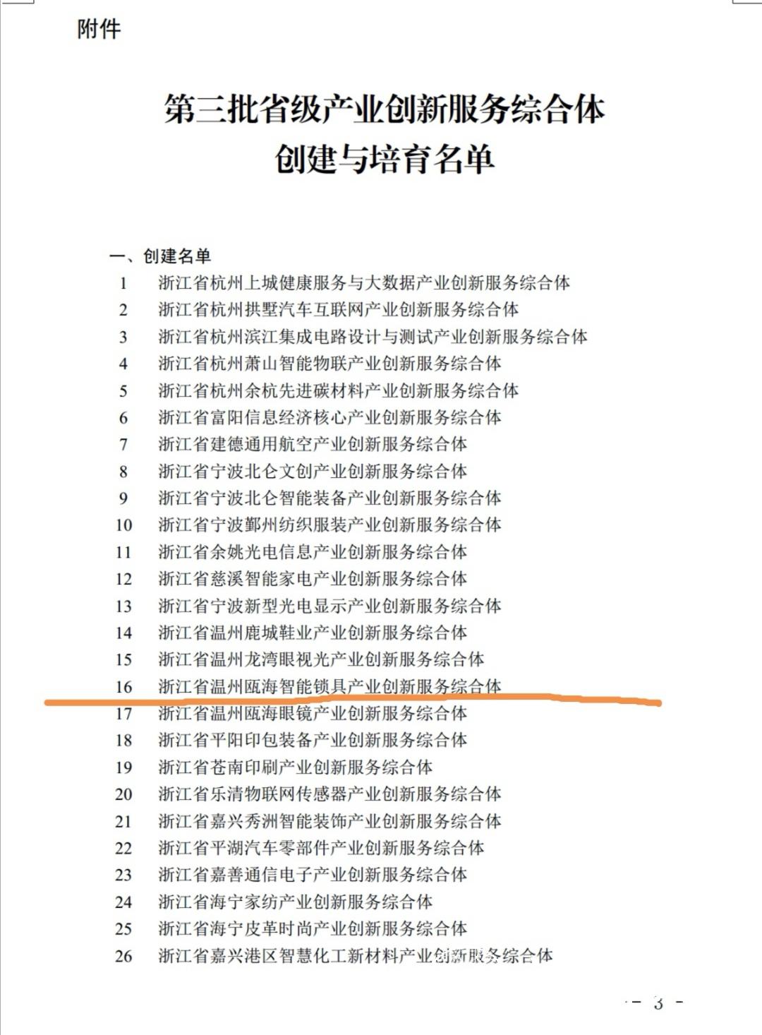 12月4日,浙江省科技领导办公室发文,第三批浙江省产业创新服务综合体创建与培育公示名单发布,由beat365官方网站智能锁具研究院负责运营与管理的浙江省温州瓯海智能锁具产业创新服务综合体列入省级创建名单。这是beat365研究院负责运行和管理的第二家产业创新服务综合体列入省级创建名单,是beat365服务地方产业发展的又一重要成果。