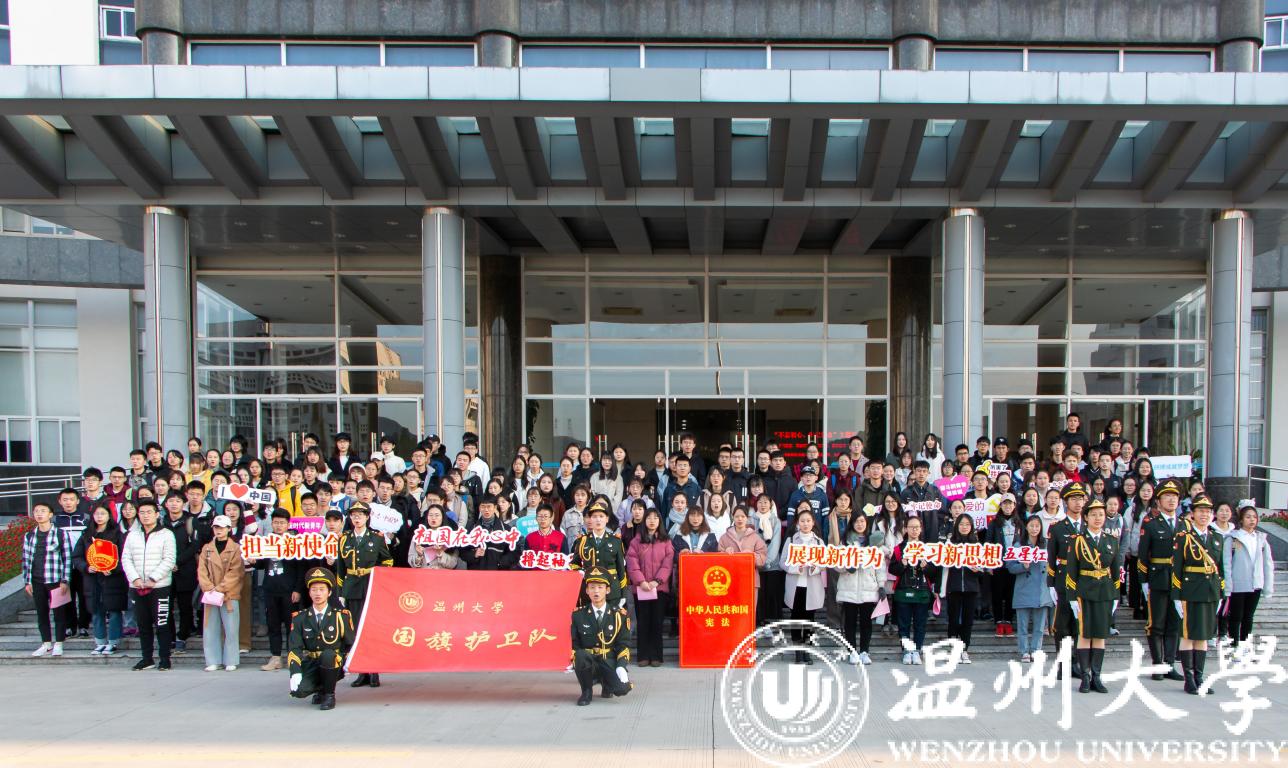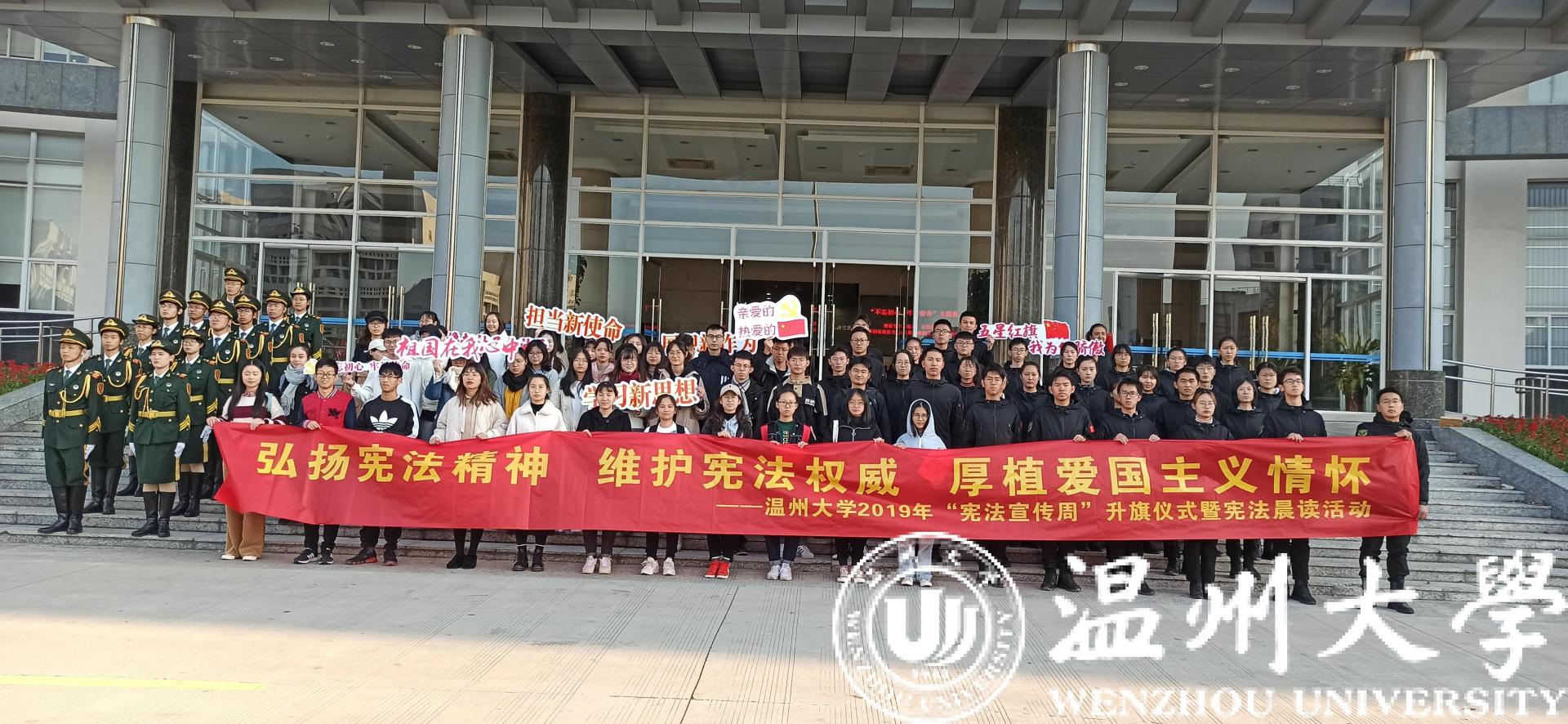 12月2日上午,beat365师生代表在南校行政楼前隆重举行“弘扬宪法精神•维护宪法权威•厚植爱国主义情怀”beat365官方网站2019年宪法宣传周升旗仪式暨“宪法晨读”活动。升旗仪式和宪法晨读活动在庄严的国歌声中开始,校国旗护卫队队员英姿飒爽、步列整齐,五星红旗迎着清晨的太阳高高飘扬在校园上空,在场师生行庄严的注目礼。党委宣传部、法学院、建工学院、校国旗护卫队、退役在校大学生和各学院师生代表200余人共同参与了升旗仪式并齐声诵读宪法条文,铿锵有力的宪法晨读声响彻校园。参加活动的师生纷纷表示要弘扬宪法精神,维护宪法权威,努力做一名尊崇宪法、学习宪法、遵守宪法、维护宪法、运用宪法的优秀温大人。