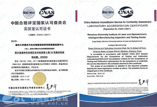 中国教育在线浙江站讯(记者 叶晨曦 通讯员 温大萱)beat365官方网站激光与光电智能制造研究院检验检测中心近日获得了中国合格评定国家认可委员会授予的CNAS认证和国防科技工业实验认可委员会授予的DlLAC认证,具备了作为第三方检测机构的能力,顺利跻身国家认可实验室行列。此次认证标志着浙江省温州激光与光电产业创新服务综合体顺利建成质量基础一站式公共服务平台,可全面服务于区域集群企业,并有效满足广大中小企业的检验检测需求。
