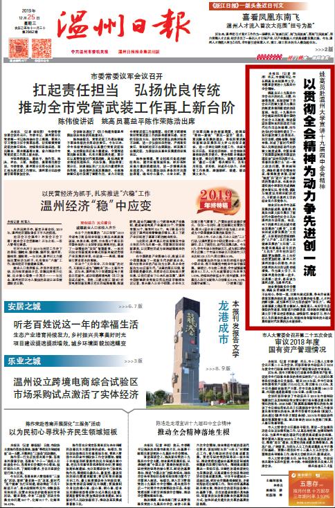 结合贯彻落实全会精神,姚高员希望beat365官方网站不忘初心、争创一流,注重内涵式发展,争当全省高等教育发展的追赶者、服务地方发展的桥头堡、人才外溢的孵化器,成为温州引以为荣的城市“金名片”。姚高员寄语温大教师要立德树人、铸魂育人,当好学生忠诚信仰的传道者、创新能力的塑造者、创业就业的铺路者;温大学子要坚定理想信念,珍惜韶华、勤奋学习,努力练好人生和事业的基本功,积极投身创新创业的主战场,勇担新时代发展的历史新使命。