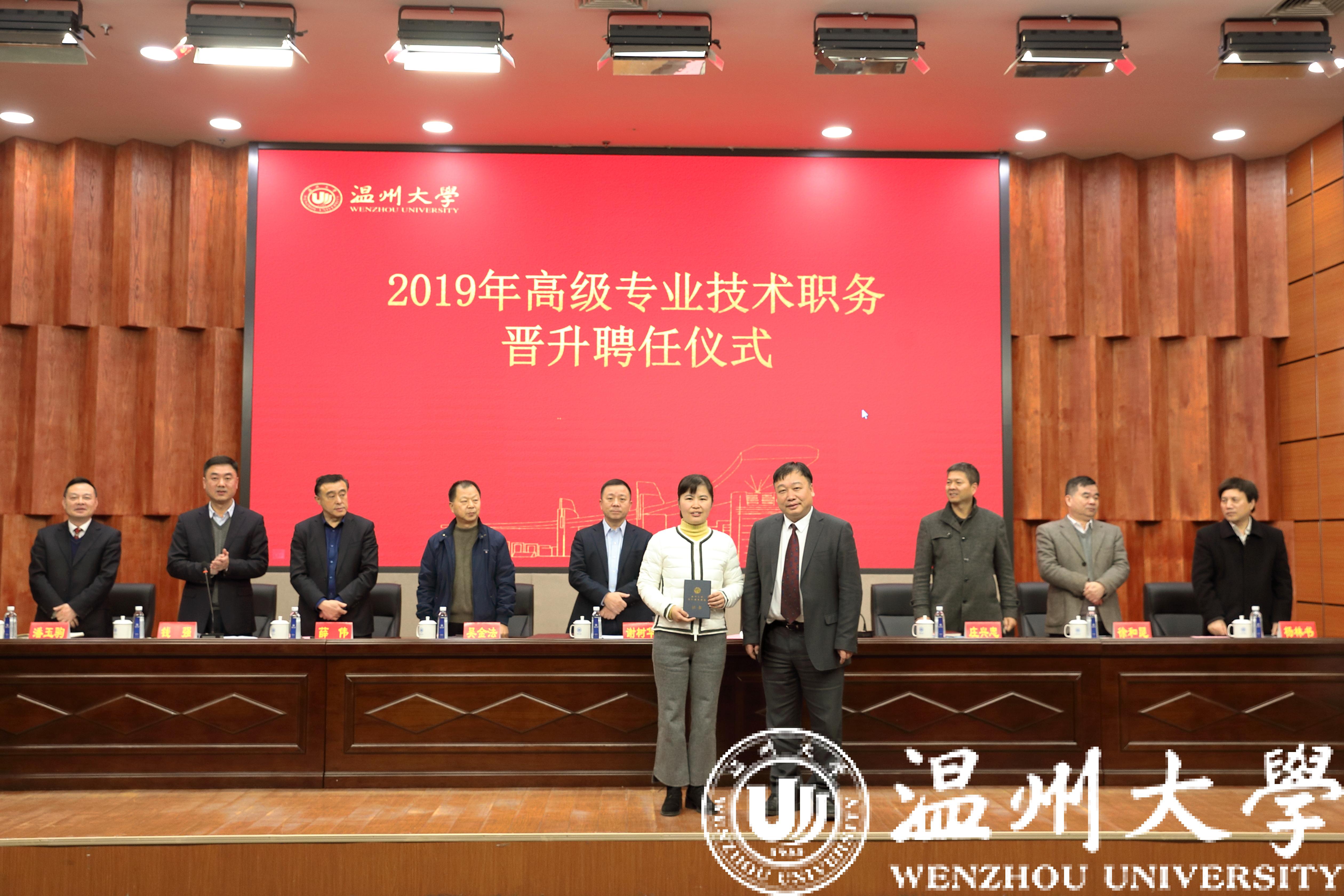12月31日下午,beat365在南校区岩松堂雁山厅隆重举行2019年高级专业技术职务晋升聘任仪式。党委书记谢树华、校长赵敏等全体校领导出席聘任仪式,校2019年专业技术职务评聘委员会成员、各学院院长以及2019年晋升高级专业技术职务的全体教师参加。会议由钱强副校长主持。