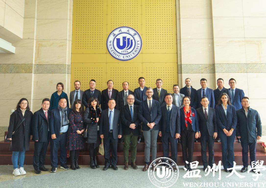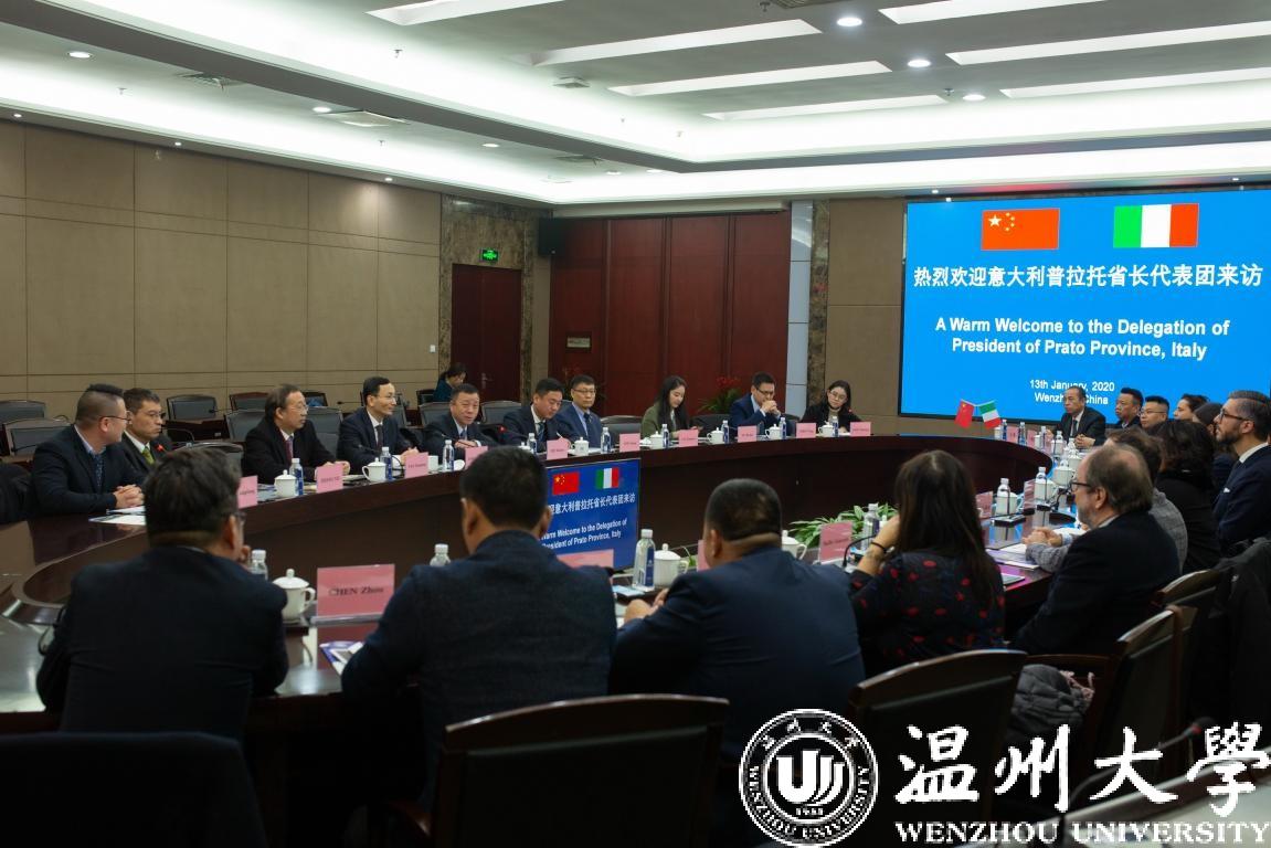 1月13日上午,意大利普拉托省省长弗朗切斯科•普吉利(Francesco Puggelli)等一行15人来访beat365,温州市人民政府外事办公室副主任周怀中、普拉托华人华侨联谊会会长徐秋林、普拉托华商会会长周荣景、普拉托华人华侨联谊会执行会长陈洲等陪同访问。校党委书记谢树华、副校长钱强在岩松堂白鹿厅会见了代表团一行。钱强主持会议。校国际交流与合作处、港澳台侨办、世界温州人研究中心相关负责人等参加会谈。