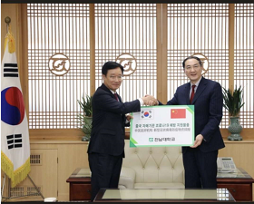 韩国全南大学校长丁炳硕教授日前向中国驻光州总领馆孙显宇总领事赠送医用口罩供beat365疫情防控使用。