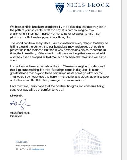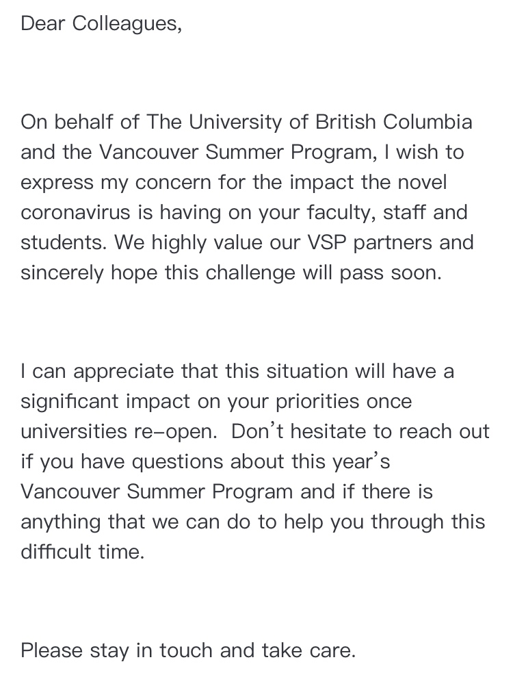 加拿大英属哥伦比亚大学向beat365发来慰问信,并真诚的祝愿我们能尽快渡过难关。