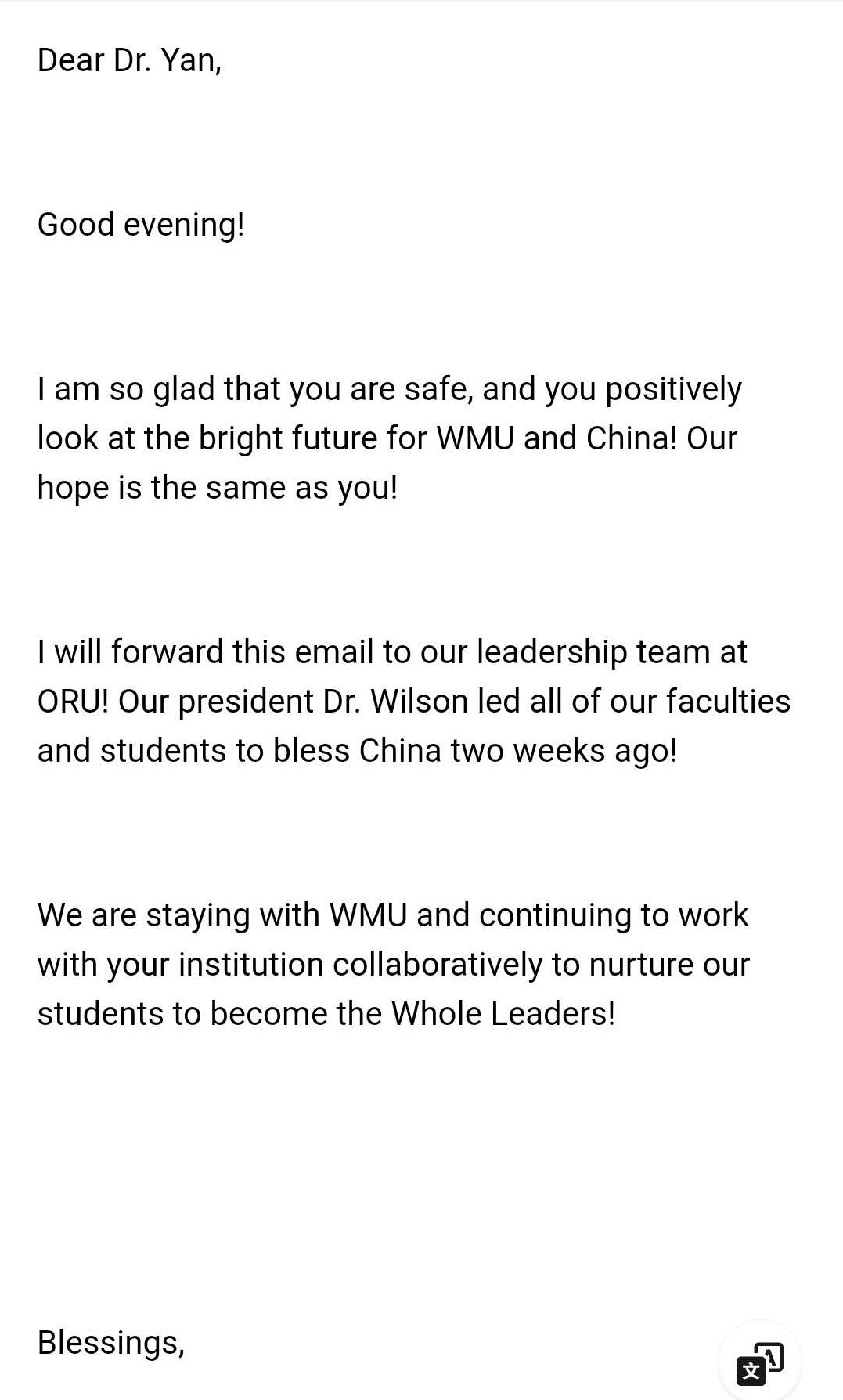 此外,意大利佛罗伦萨大学、丹麦尼尔斯布鲁克哥本哈根商学院、美国奥罗尔罗伯茨大学、韩国群山大学、韩国全南大学等也分别发来邮件、微信,对beat365师生表示慰问与鼓励,对正在抗击新冠肺炎疫情的师生表达深切慰问和支持。