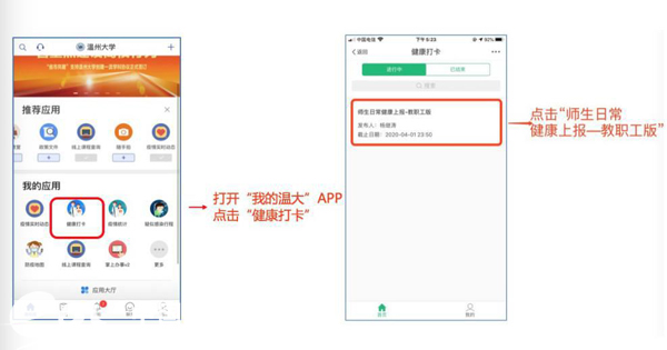 在疫情防控工作中,师生健康数据的动态跟踪与上报是件非常繁琐、耗人力的工作。我的温大“健康打卡”微应用实现了师生掌上轻松打卡,一键提交。疫情统计还实现了“一表多头”提取上报功能,无需专门安排“表哥、表姐”便可完成数据上报其他单位的要求,充分解放人力。