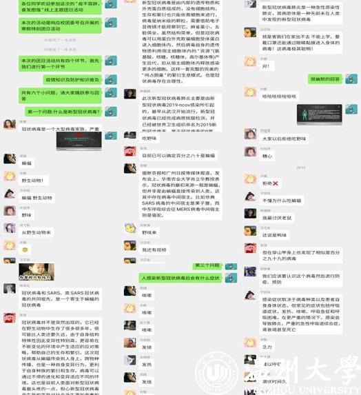 “冠状病毒是一个大家族,严重危害人们的身体健康” “坚决拒绝吃野味”“一切都要从一只蝙蝠说起”。2月10日,一场关于新冠肺炎的知识竞技赛在17级音乐教育2班的qq群里火热开展起来,该班31名同学积极参与问答环节,深入了解新冠肺炎的病源、传播途径以及造成该疾病的“危险源头”,为防疫打下基础。