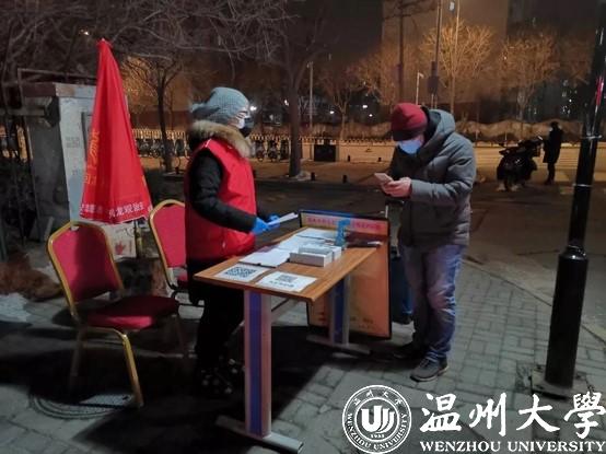2月20日,作为校星之火志愿者协会的一员,这是钱依范参加协会组织的青年防疫突击队的第18天,自2月2日起,他就在瓯海茶山“先锋岗”值班。禁止外地人进村、给往来的村人测量体温并记录是他志愿者工作的日常。值班的时间段安排是凌晨四点到八点,晚上八点到十二点。每天在平均温度3、4摄氏度的室外伫立,经常脚会被冻麻。为了御寒,他值班时常常不停的跺脚,尤其是晚上夜班,更是寒风刺骨。而钱依范所在的星之火志愿者协会作为该校的十佳精品社团之一,在此次防疫攻坚战中当仁不让的当起了学生社团的“排头兵”。