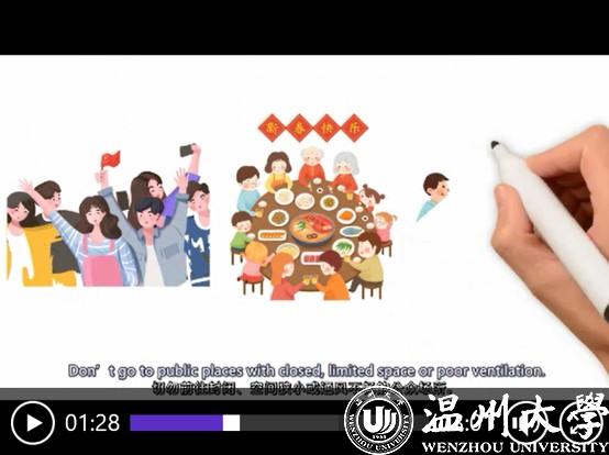 “减少不必要接触、保持良好的个人卫生习惯、不要散布谣言、对捕杀和买卖野生动物说‘不’……”近日,瓯江学院发布了全英文手绘防疫视频《抗疫情、树新风、立后盾》,以通俗易懂的语言、生动活泼的画面介绍了新冠肺炎的公众预防知识,并向全球大学生发出倡议要树立文明新风,保护共同的地球家园。