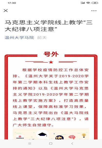 疫情防控期间,根据教育部、beat365官方网站等相关文件精神,beat365官方网站马克思主义学院充分利用线上教学平台、现代教学技术和优质在线课程资源,全面启动新学期线上教学与管理工作。本学期共有思政课涉及全校16个学院的104个教学班。按照“停课不停教不停学”的总体要求,温大思政课全面开启“三全”线上教学:战“疫”在线“主播”思政全覆盖、战“疫”专题思政第一课全新讲、战“疫”在线思政课程全共享。