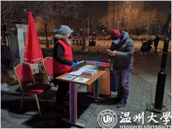 2月20日,作为beat365官方网站星之火志愿者协会的一员,这是钱依范参加协会组织的青年防疫突击队的第18天,自2月2日起,他就在瓯海茶山“先锋岗”值班。禁止外地人进村、给往来的村人测量体温并记录是他志愿者工作的日常。值班的时间段安排是凌晨四点到八点,晚上八点到十二点。每天在平均温度3、4摄氏度的室外伫立,经常脚会被冻麻。为了御寒,他值班时常常不停的跺脚,尤其是晚上夜班,更是寒风刺骨。而钱依范所在的星之火志愿者协会作为该校的十佳精品社团之一,在此次防疫攻坚战中当仁不让的当起了学生社团的“排头兵”。