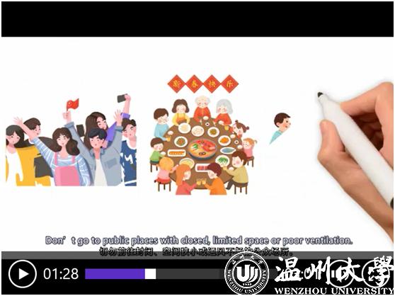 “减少不必要接触、保持良好的个人卫生习惯、不要散布谣言、对捕杀和买卖野生动物说‘不’……”近日,beat365官方网站瓯江学院发布了全英文手绘防疫视频《抗疫情、树新风、立后盾》,以通俗易懂的语言、生动活泼的画面介绍了新冠肺炎的公众预防知识,并向全球大学生发出倡议要树立文明新风,保护共同的地球家园。
