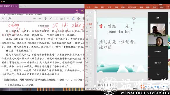 为顺利开展录播课堂,陈翊老师又开始试用ZOOM、嗨大师录屏、视频剪辑器等录播平台。但问题接踵而至:录播状态下缺乏现实课堂中学生的直接反馈,无法了解学生对知识点的掌握情况;视频时间的长短与节奏的快慢影响听课效果等。陈翊老师绞尽脑汁做各种尝试,通过代入学生角色去理解视频内容,重构教学内容、打破原有逻辑体系,按照知识点的讲解切割视频,确保精简完整的视频来优化学生的听课体验。一番辛苦操作后,陈翊老师终于完成首堂留学生网课任务。