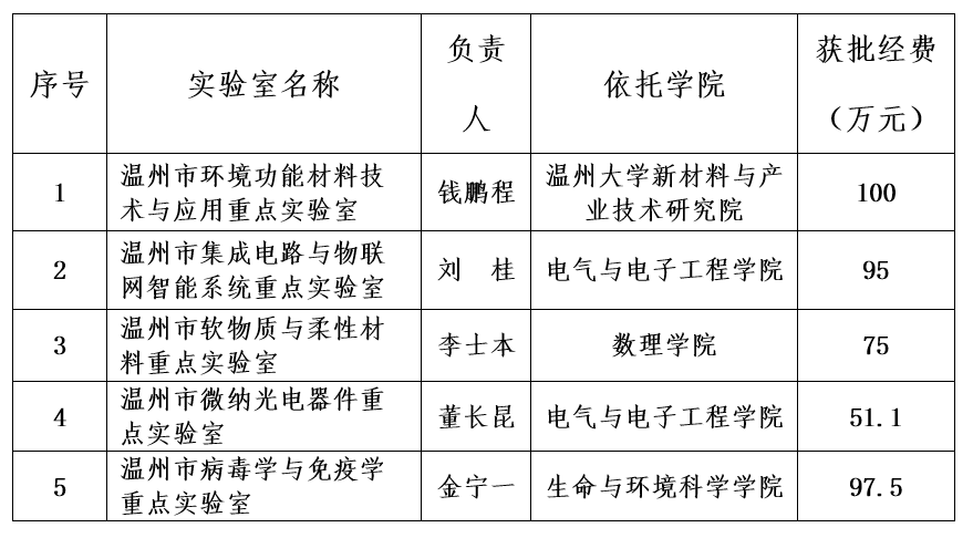 近日,温州市科技局公布了2020年度市级重点实验室(工程技术研究中心)评审结果,beat365申报的温州市环境功能材料技术与应用重点实验室、温州市集成电路与物联网智能系统重点实验室、温州市软物质与柔性材料重点实验室、温州市微纳光电器件重点实验室 、温州市病毒学与免疫学实验室获得立项,目前beat365共有16家温州市重点实验室(工程技术研究中心)。
