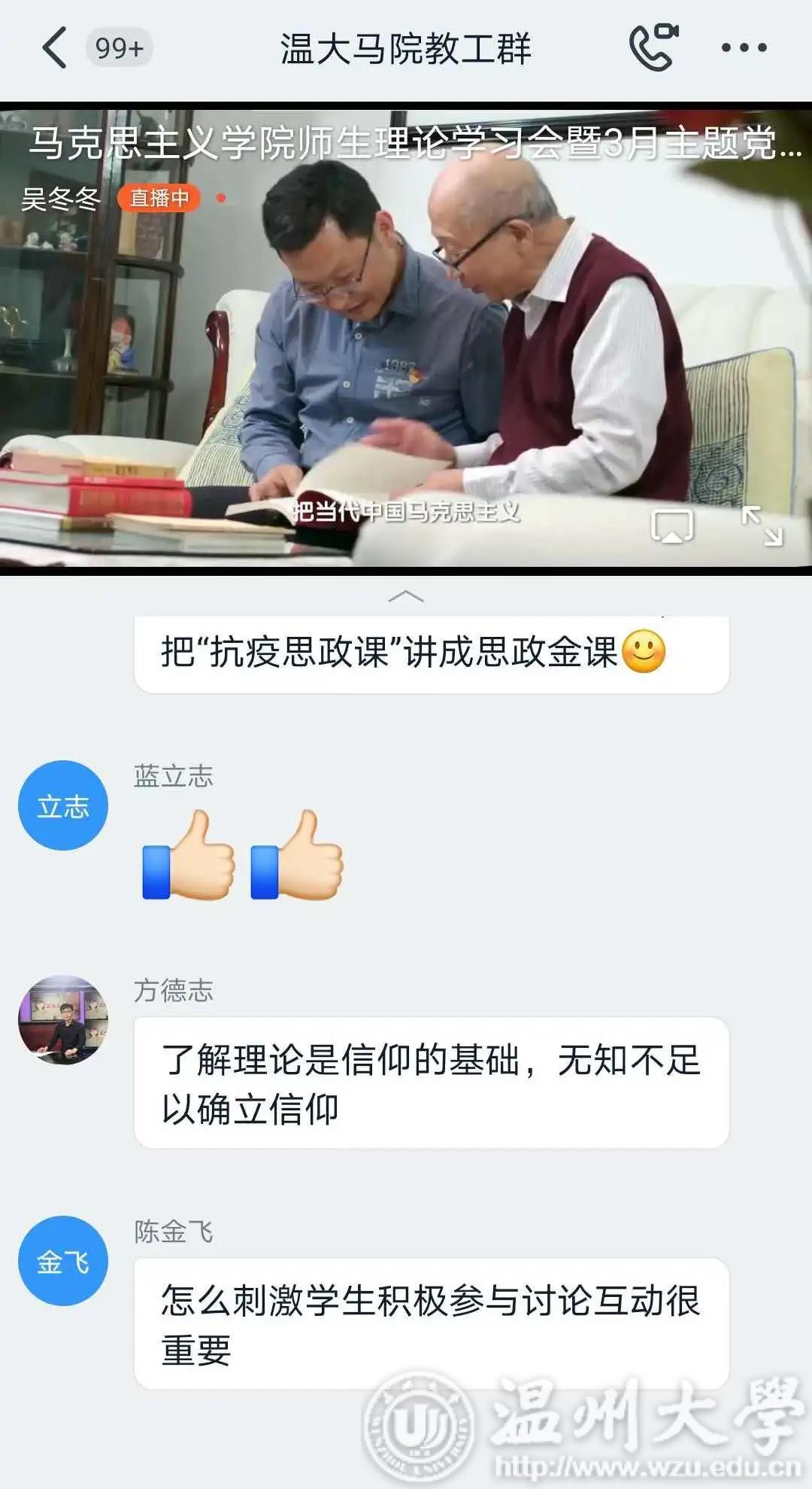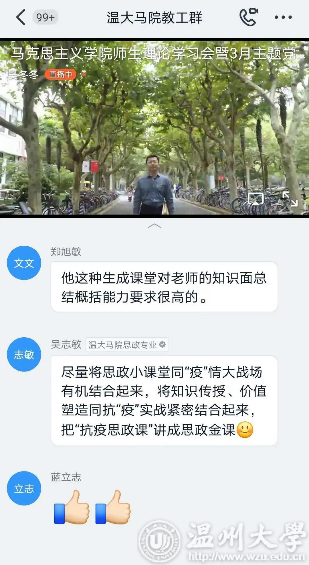 为贯彻落实习近平总书记关于新冠肺炎疫情防控工作的重要讲话和指示精神,全力支持配合打赢疫情防控人民战争、总体战、阻击战,深化新时代高校思政课改革创新,按照教育部党组“停课不停教、停课不停学”的工作要求,我院充分利用线上教学平台和优质在线课程资源,全面开启战“疫”在线“主播”思政全覆盖、战“疫”专题思政第一课全新讲、战“疫”在线思政课程全共享的“三全”线上教学活动。