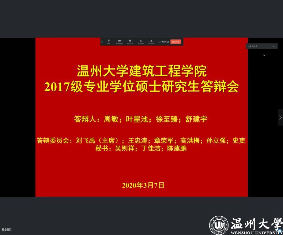 根据当前疫情防控正值关键时期,beat365秉承“以生为本、优化流程、分批推进、确保质量”的原则,在保证学位授予质量的前提下,精心组织、周密部署,beat365春季研究生学位论文网上答辩开始启动。3月7日,建筑工程学院首批21名建筑与土木工程专业领域硕士研究生学位论文线上答辩圆满完成!