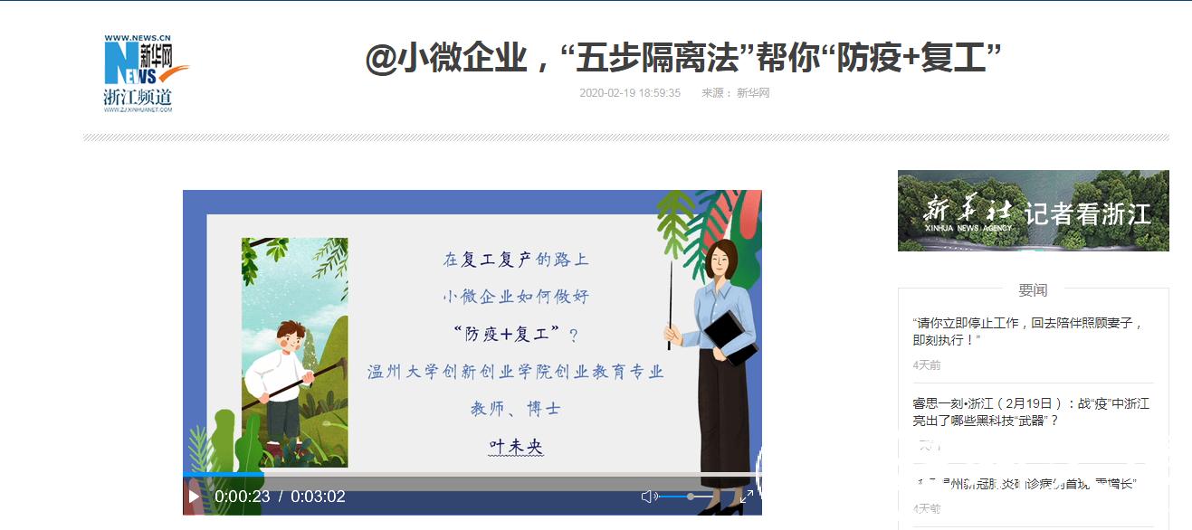 民盟温大委员会盟员叶未央为小微企业“防疫+复工”定制“五步隔离法”,简单、易操作,用实招帮助小微企业在特殊时期规范有序复工复产,被新华网浙江频道采访报道。