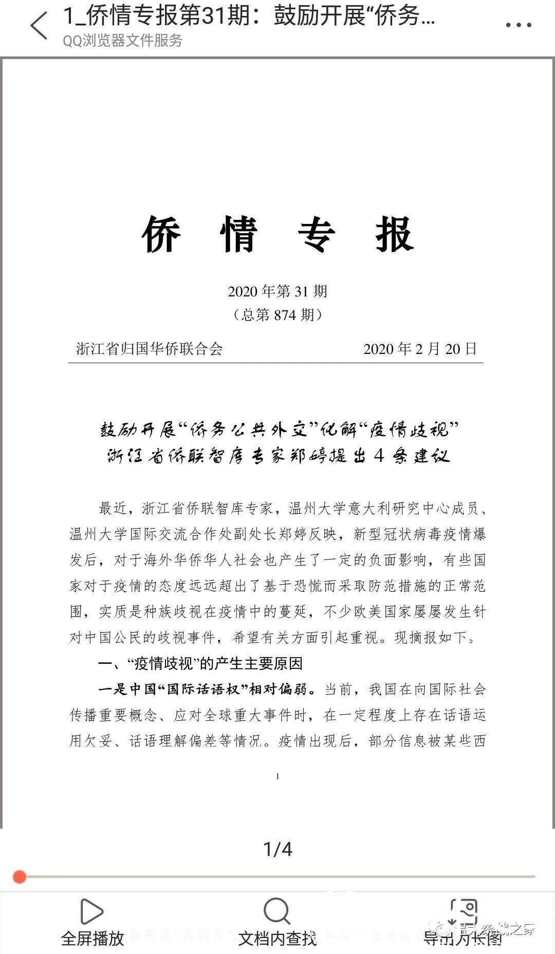 温大侨务公共外交研究所罗珊冰、毛继光就意大疫情期间,华侨乘机回国求医状况提出建议,分别报送浙江省教育厅和浙江省归国华侨联合会。