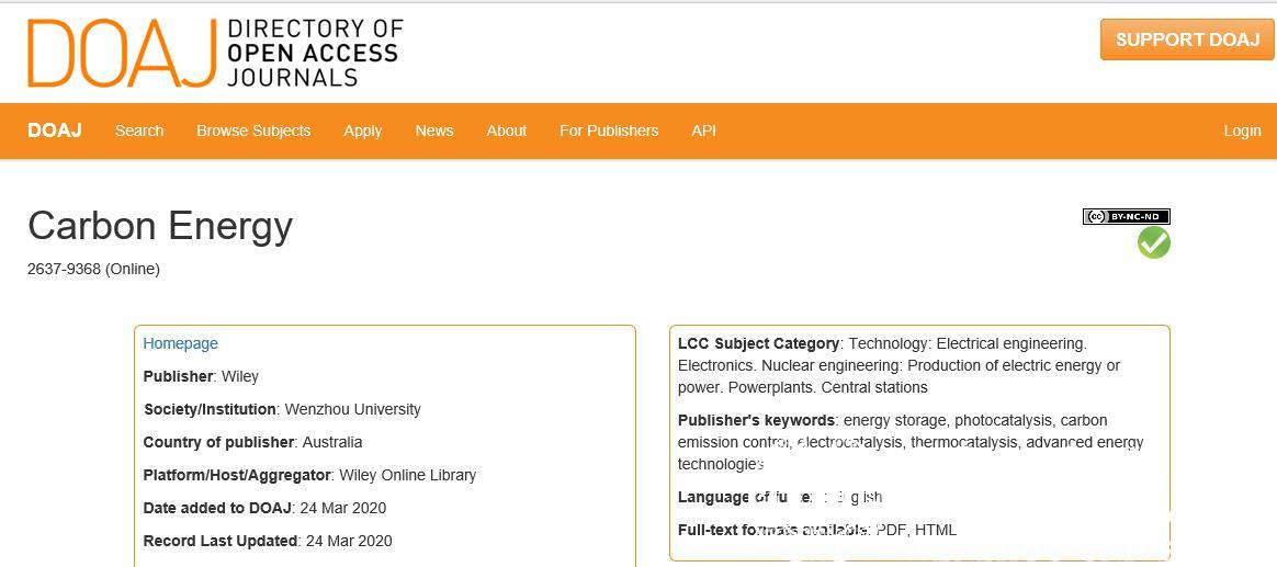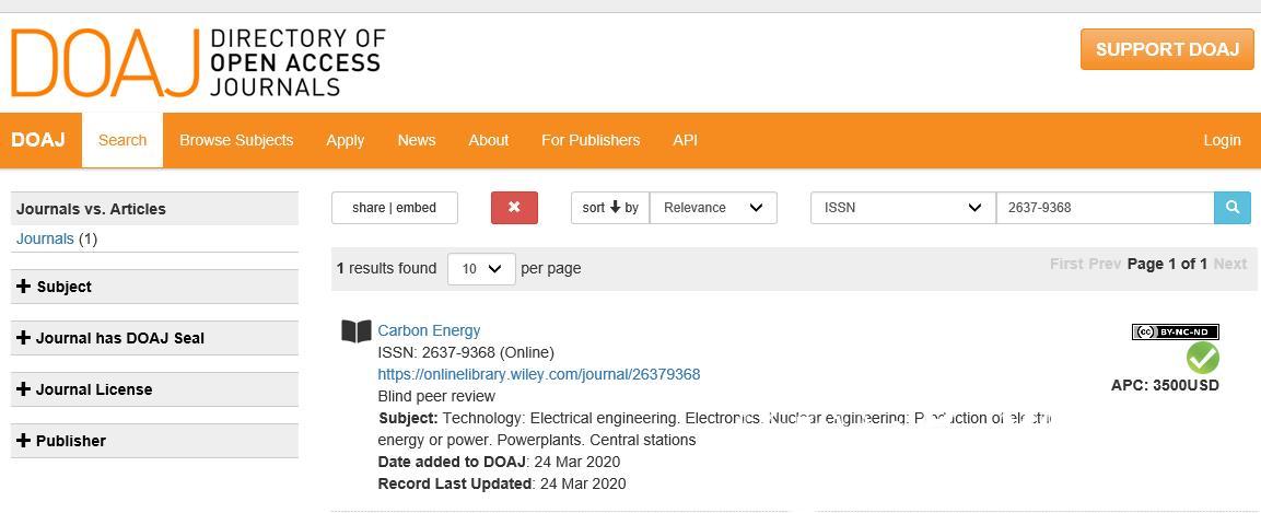 beat365主办的CarbonEnergy期刊通过全球最具影响力的开放存取期刊目录(Directory of Open Access Journals,DOAJ)评估后,于3月24日被DOAJ数据库正式收录(查询地址:https://doaj.org/)。