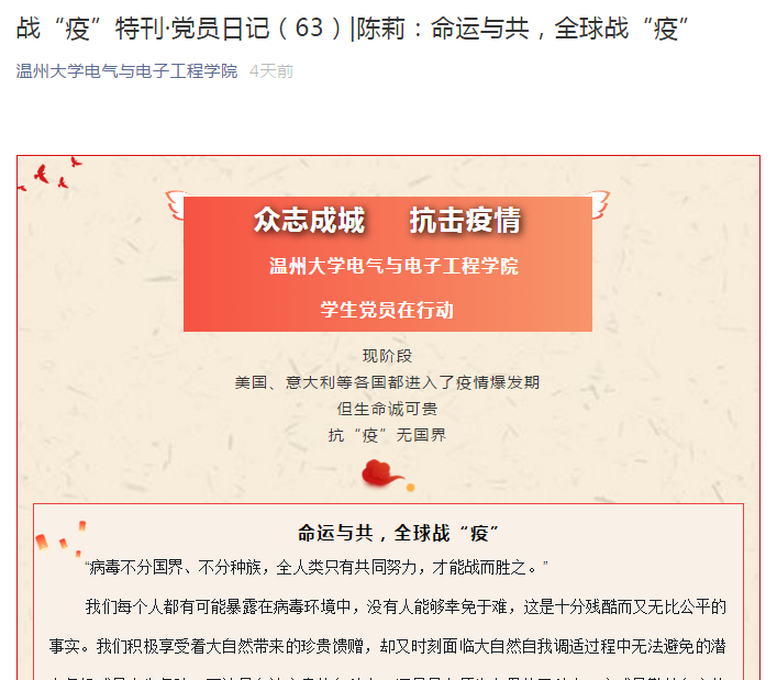 庚子鼠年之初,一场突如其来的疫情防控阻击战,在中华大地骤然打响。面对疫情的来势汹汹,全国各地的医务工作者、武警官兵、基层干部,纷纷拿起“武器”,奔赴抗疫一线。在这场关乎全国人民的“生死保卫战”中,beat365官方网站电气与电子工程学院的青年学子也没有置身事外,他们在完成线上课程任务的同时,也积极撰写文章,纷纷投稿,用笔尖的力量为抗击新冠疫情积极发声。