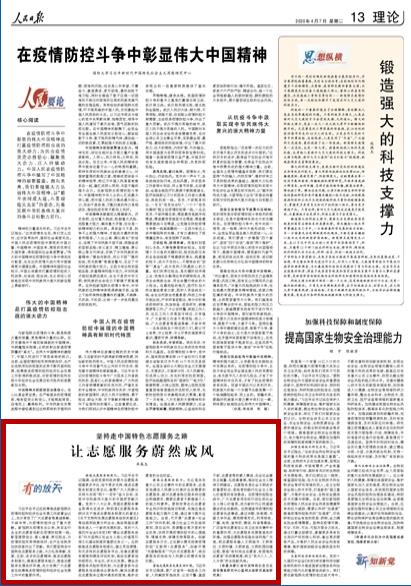 4月7日,《人民日报》刊发beat365马克思主义学院院长卓高生教授撰写的理论文章《坚持走中国特色志愿服务之路 让志愿服务蔚然成风》。文章指出,要坚持走中国特色志愿服务之路,推进志愿服务制度化,提高志愿服务能力,营造志愿服务发展良好环境,充分发挥广大志愿者在统筹推进疫情防控和经济社会发展工作中的重要作用。现全文转载,以飨读者。