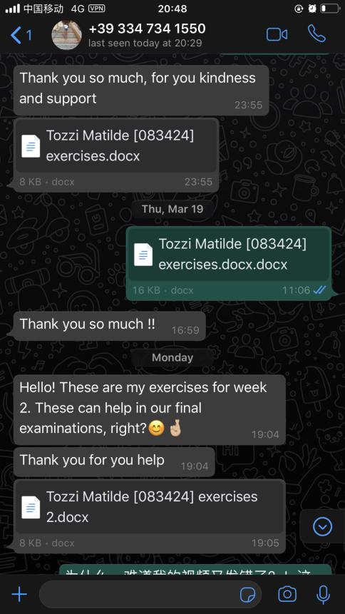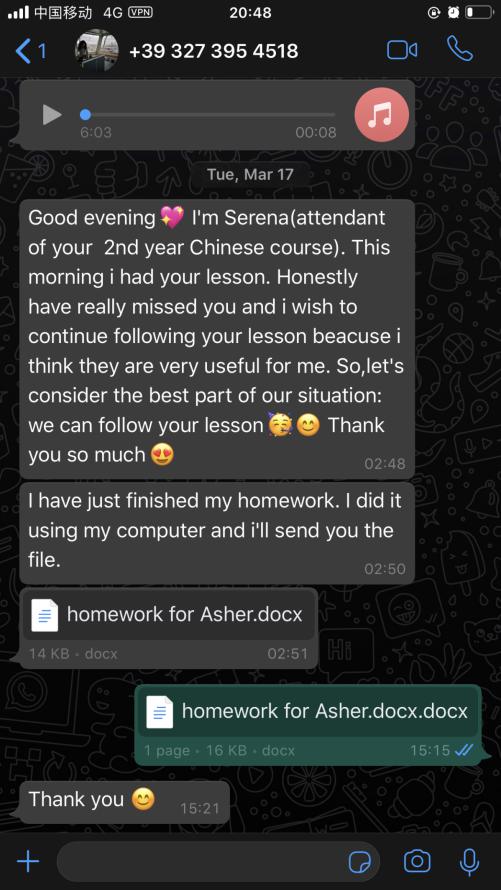 每一周,张珉璐都会精心把每个年级的两小时课程视频录制好,与音频、ppt、练习作业及一些额外的针对不同级别HSK的练习发送给意大利老师,意大利老师再上传至beat365官方网站意大利分校的学习平台,学生通过平台下载视频和学习资料进行学习。