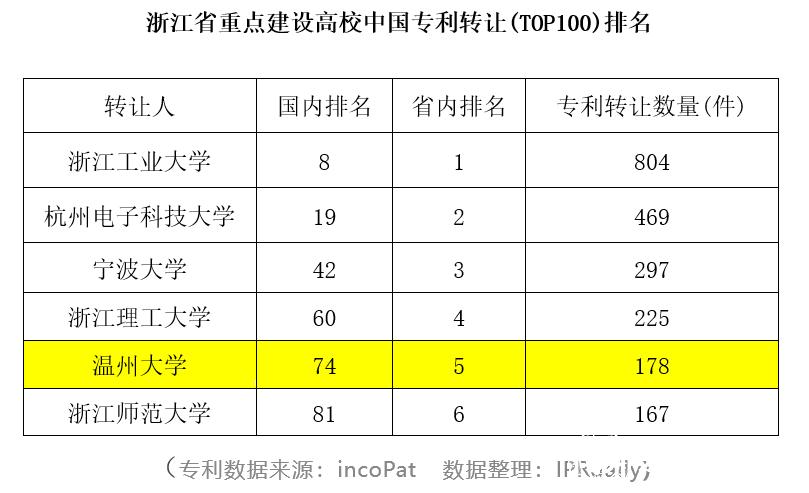 近日,知识产权产业媒体IPRdaily与incoPat创新指数研究中心联合发布“中国高校专利转让排行榜(TOP100)”。榜单对截至2020年2月5日,中国高校在中华人民共和国国家知识产权局登记生效的专利申请权/专利权转让数量(不含港澳台)进行统计排名,beat365官方网站位列全国第74位,在浙江省重点建设高校中排名第5。