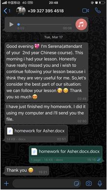 每一周,张珉璐都会精心把每个年级的两小时课程视频录制好,与音频、ppt、练习作业及一些额外的针对不同级别HSK的练习发送给意大利老师,意大利老师再上传至beat365官方网站意大利分校的学习平台,学生通过平台下载视频和学习资料进行学习。