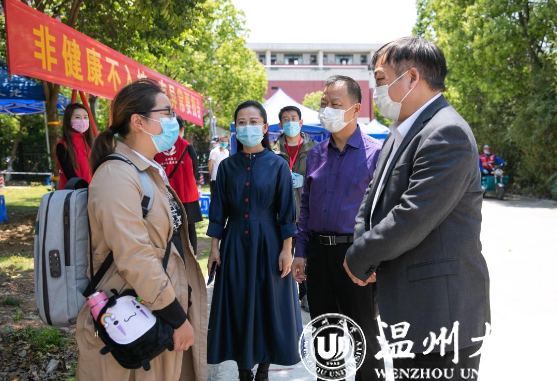 期间,校党委书记谢树华、校长赵敏、党委副书记吴金法等校领导,先后到超豪学区学生报到点、学生寝室、学生食堂等实地查看返校情况,看望首批返校的学生,并叮嘱师生做好个人安全健康防护。温州市教育局白炳兴副书记一行在动车站温大接站点检查指导接站工作。
