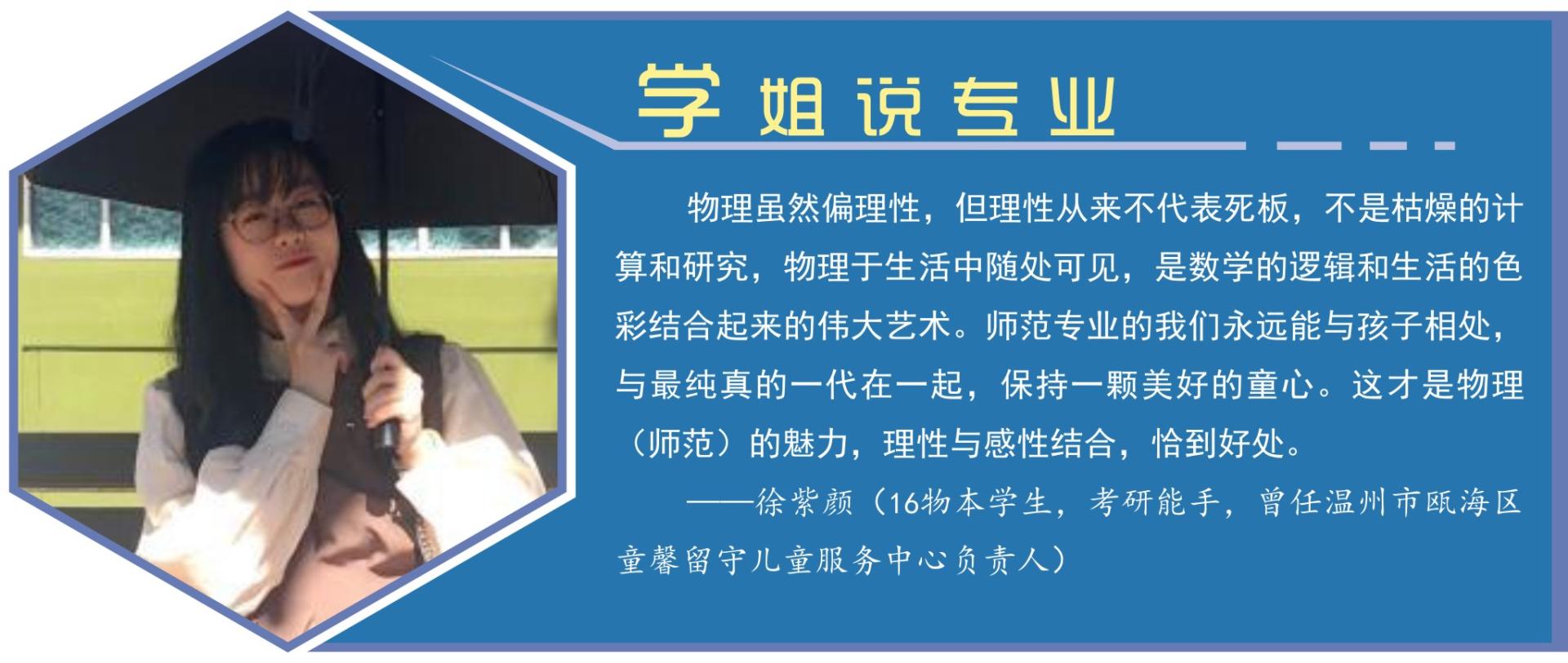 本专业以培养中学物理、中小学科学、高中通用技术教师及考研深造为主要目标,兼顾培养教育类或物理类的研究型人才。在长期办学过程中,形成了“厚基础、宽口径、重实践、强能力、能担当”的办学特色,为社会培养和输送了近5000多名专业人才,不论是在基础教育界还是高等教育界,不论是在政界还是商界,都有杰出校友的身影。他们有的是科学家、教授,有的是省重点中小学校长或特级教师,有的是教育部门负责人,还有的是经营有方的著名企业家。丰富的校友资源也为在校生成长提供了额外福利,一些校友不仅在学生毕业发展方面给予必要支持,还回校成立奖助学金,帮助学生学习成长。