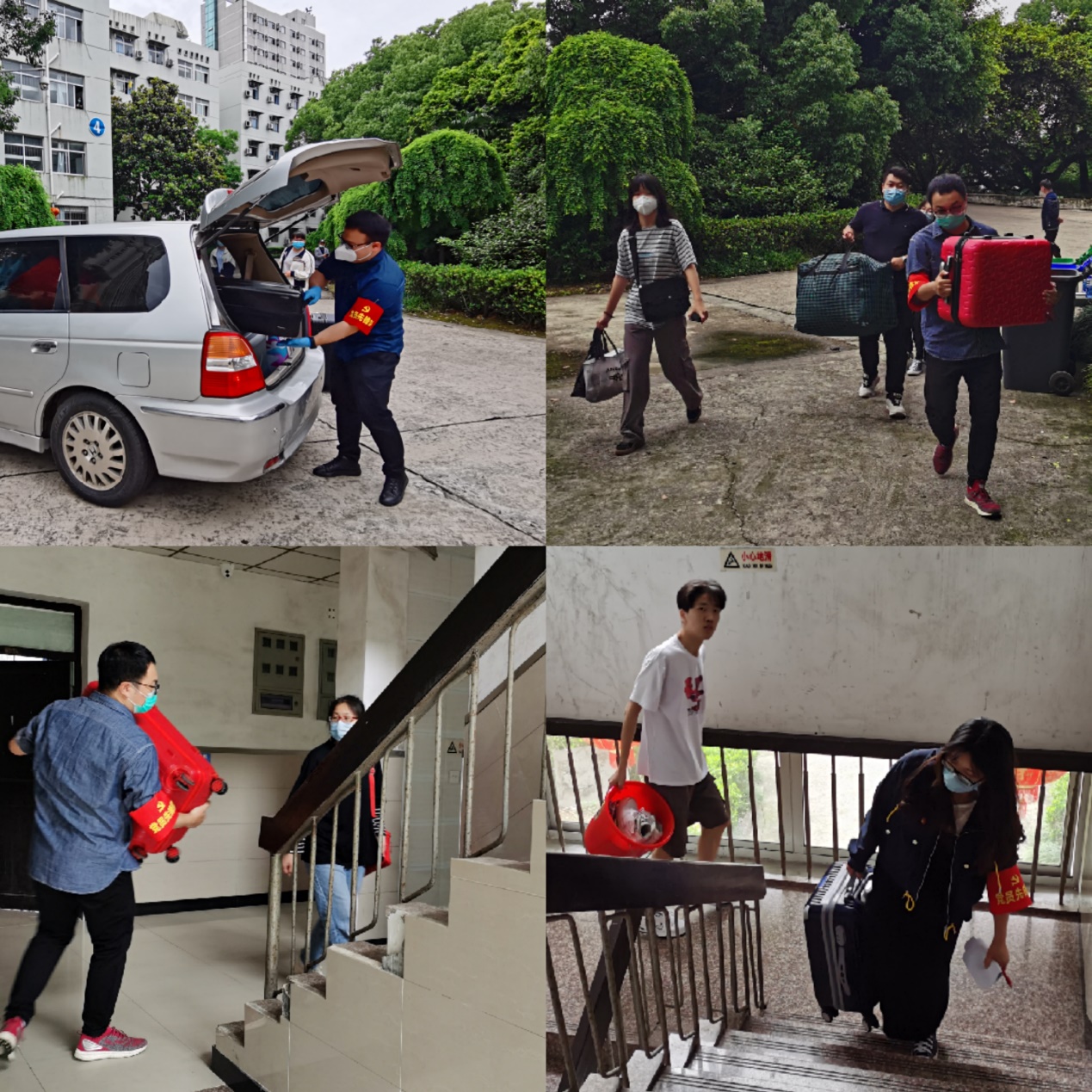 毫无疑问地,我们的党员先锋队上!党员先锋队临时征用了学院的两部通勤车辆,承担起从校门口到公寓区的行李运送工作。行李送达公寓区后,又面临着搬上楼的重任,于是我们的学生党员、入党积极分子也加入到党员先锋队的行列——有的行李一趟搬不完我们就来回两趟;有的楼栋人手不足,女生也加入“战场”……从栋2楼到栋6楼,从一层到六层,党员先锋队干得热火朝天,大汗淋漓,有的党员半天下来,单单跑楼梯就2万多步了!但是当听到同学们那句发自肺腑的“谢谢您”和“老师(同学)辛苦了”时,这一切又显得那么值得,那么有意义!