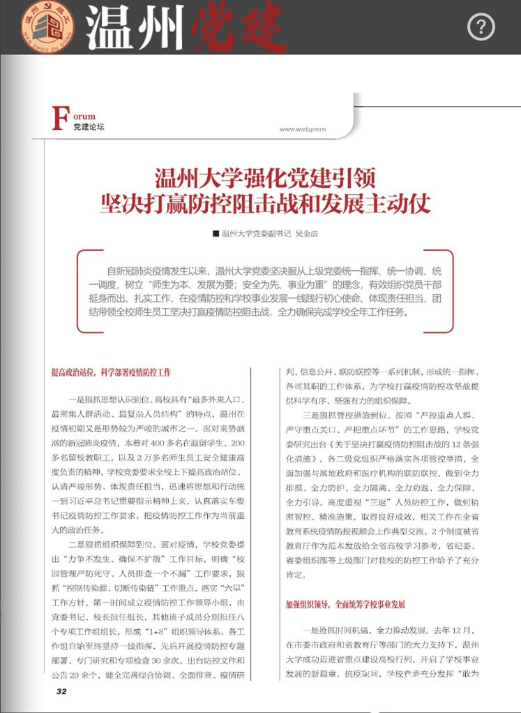 【编者按】近日,《温州党建》全文刊载beat365党委副书记吴金法的理论文章《beat365官方网站强化党建引领坚决打赢防控阻击战和发展主动仗》,现全文转载,以飨读者。