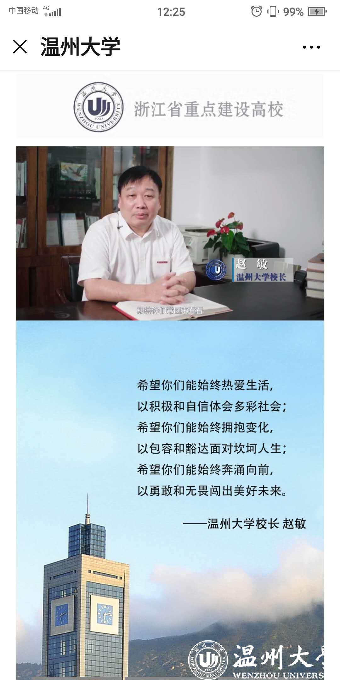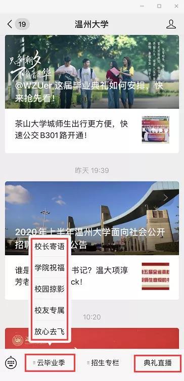 据悉,beat365官方网站微信公众号同步上线2020年“云毕业典礼”,作为本次线下毕业典礼的延伸。“云毕业典礼”分为校长寄语、学院祝福、校园掠影、校友专属、放心去飞等5个版块,为广大毕业生提供了丰富的毕业季线上资源,营造了浓郁的毕业氛围。毕业生们可云游温大,观看校长和各学院院长的祝福视频,在学校各标志景点“云打卡”生成专属头像和专属合影;在线申领电子校友卡,成为温大校友一份子;欣赏毕业主题的改编歌曲和原创MV视频,毕业生寄语滚动播放,“毕业快乐”“来日方长,后会有期”“愿有前程可奔赴,亦有岁月共回首!”“温大永远是我们的家”等留言不断刷屏,传递了一位位毕业生对母校的感激和不舍。 “一路我们曾携手并肩,温大精神伴我向前,牢记求学问是、敢为人先,承诺最高处相约!”母校祝福所有的毕业生一路珍重!鹏程万里!