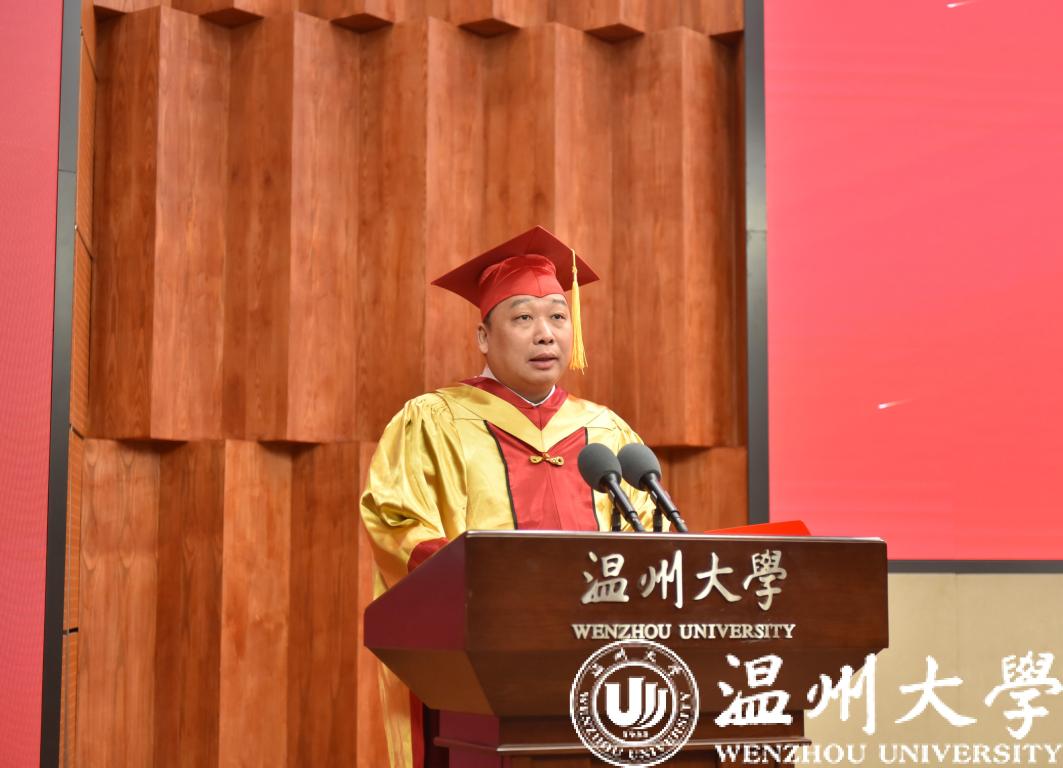“今天,是属于你们的高光时刻!2020届毕业生顺利完成学业,即将开启人生新的征程!” 赵敏校长为全体毕业生致辞。由于疫情的影响,只有部分毕业生代表能够到现场参加毕业仪式,“作为校长,不能一一为你们拨穗正冠、面对你们道一声‘祝贺’,我的内心难掩遗憾。”但在这美好且特殊的时刻,校长更是为即将奔赴未来的毕业生们感到喜悦、激动和自豪。他寄语毕业生,希望同学们感悟新时期抗“疫”精神,始终保持真真切切的家国情怀,因为家国情怀是一个人最根本、最深沉的力量;感悟新时代温州人精神,始终保持敢闯敢拼的奋进姿态,因为身处温州的你们,敢闯敢试、创新创业,也刻下了温州人精神的深刻烙印;感悟新时代温大精神,始终保持追梦圆梦的持久恒心,因为你们是温大学子,身上有温大基因,温大精神已经熔铸于每个人的骨髓。他希望毕业生以“三种精神”为引领,乘风破浪,无畏前行。最后,赵敏校长深情说道:“请将母校对你们的牵挂装入行囊,趁年轻,大胆勇敢去闯吧,做奔涌澎湃的‘后浪’,不惧风雨、一往无前!母校永远是你们最坚强的后盾!”