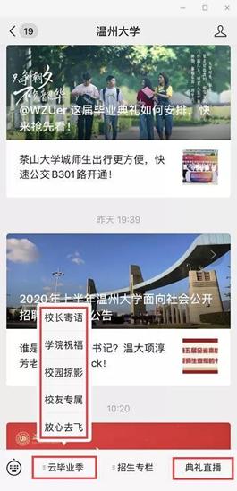 据悉,为了让受疫情影响不能到场的毕业生感受到毕业氛围,beat365官方网站微信公众号同步上线2020年“云毕业典礼”,作为本次线下毕业典礼的延伸。“云毕业典礼”分为校长寄语、学院祝福、校园掠影、校友专属、放心去飞等5个版块,为广大毕业生提供了丰富的毕业季线上资源,营造了浓郁的毕业氛围。毕业生们可云游温大,观看校长和各学院院长的祝福视频,在学校各标志景点“云打卡”生成专属头像和专属合影;在线申领电子校友卡,成为温大校友一份子;欣赏毕业主题的改编歌曲和原创MV视频,毕业生寄语滚动播放,“毕业快乐”“来日方长,后会有期”“愿有前程可奔赴,亦有岁月共回首!”“温大永远是我们的家”等留言不断刷屏,传递了一位位毕业生对母校的感激和不舍。 “一路我们曾携手并肩,温大精神伴我向前,牢记求学问是、敢为人先,承诺最高处相约!”母校祝福所有的毕业生一路珍重!鹏程万里!