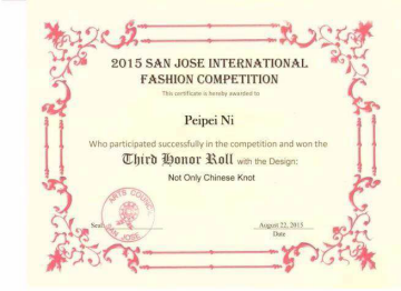 在2015年8月举办的美国圣荷西首届国际时装设计大赛中,作品《NotOnly ChineseKnot》荣获最高奖项,作品《冰岛童话镇》荣获最佳现代时尚奖,作品《红豆生南国》获优秀奖。