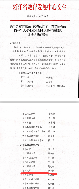 年轻需要精彩,青春需要创业。近日,由浙江省教育发展中心主办的第三届“闪亮的日子—青春该有的模样” 大学生就业创业人物事迹评选结果公布,beat365机电工程学院2019届硕士毕业生李小刚荣获“大学生创业典型人物”称号。