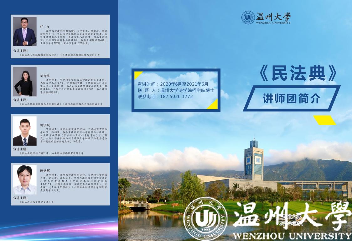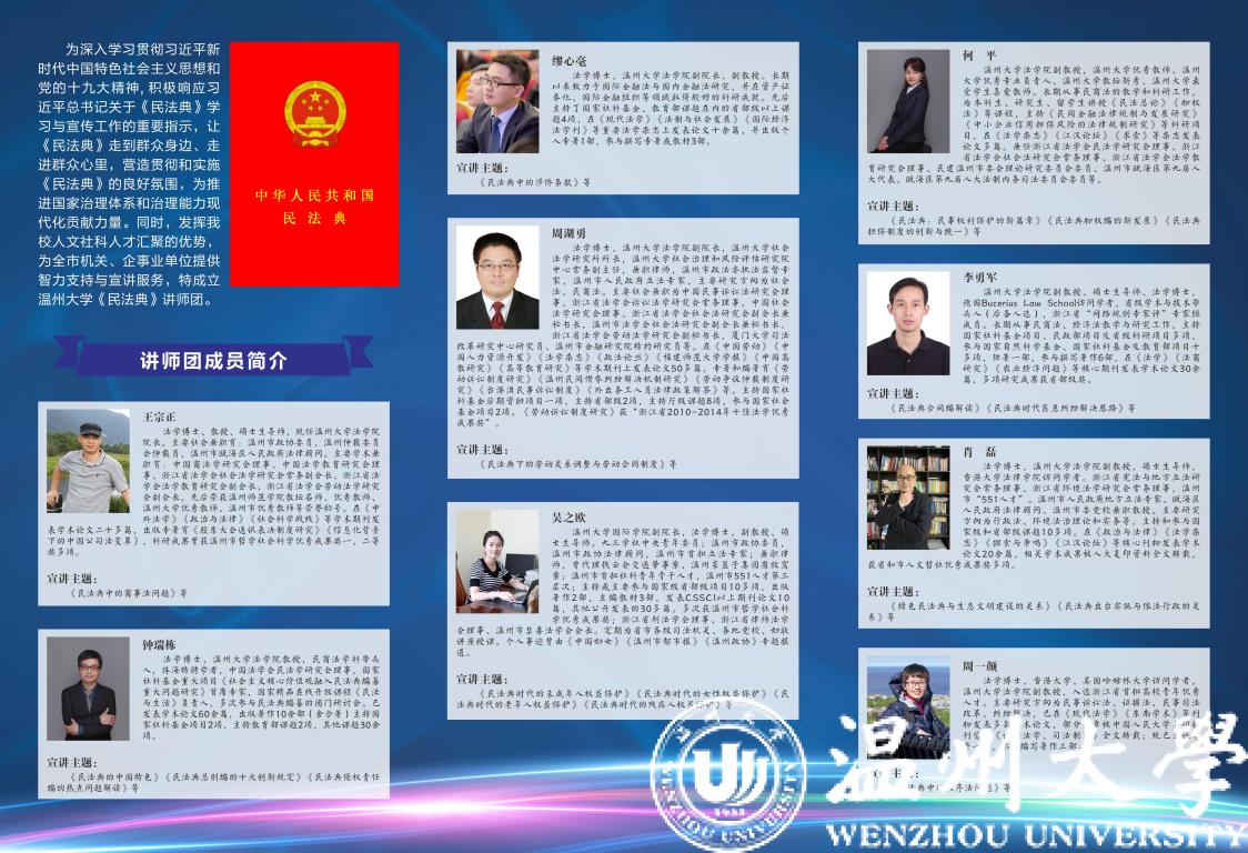 据介绍,为深入学习贯彻落实习近平总书记关于切实实施民法典的重要讲话精神,推进民法典普法宣传工作,beat365官方网站充分发挥法学人才汇聚的专业学科优势,遴选了来自该校法学院相关领域的13位专家学者,组建民法典普法讲师团,讲师团的专家学者们精心准备了《民法典中的商事法问题》《民法典编纂技术的中国特色》《民法典总则编的十大创新规定》《民法典侵权责任编的热点问题解读》《民法典中的涉侨条款》《民法典下的劳动关系调整与劳动合同制度》《民法典时代的未成年人、女性、老年人、残疾人权益保护》《民法典合同编解读》《绿色<民法典>与生态文明建设的关系》《民法典出台实施与依法行政的关系》《民法典人格权编、继承编的解释与适用》《民法典婚姻家庭编新规解读》《民法典与两岸经贸交流》等系列“金课”,为校内师生和校外各企事业单位开展民法典普法宣讲活动,他们将走进机关、学校、企事业单位、军营、村镇街道等基层一线,开展系统化、常态化的普法宣讲,使民法典走到群众身边、走进群众心里。