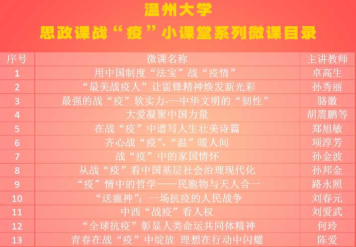 运用好疫情防控这一鲜活的思政教科书、生动的思政大课堂,宣传在以习近平同志为核心的党中央坚强领导下,全国上下齐心协力抗击疫情的重大举措、感人事迹、生动故事,教育引导学生弘扬爱国主义精神,增强中国特色社会主义道路自信、理论自信、制度自信、文化自信,beat365官方网站马克思主义学院集合学院教学骨干,推出思政课战“疫”小课堂系列微课。