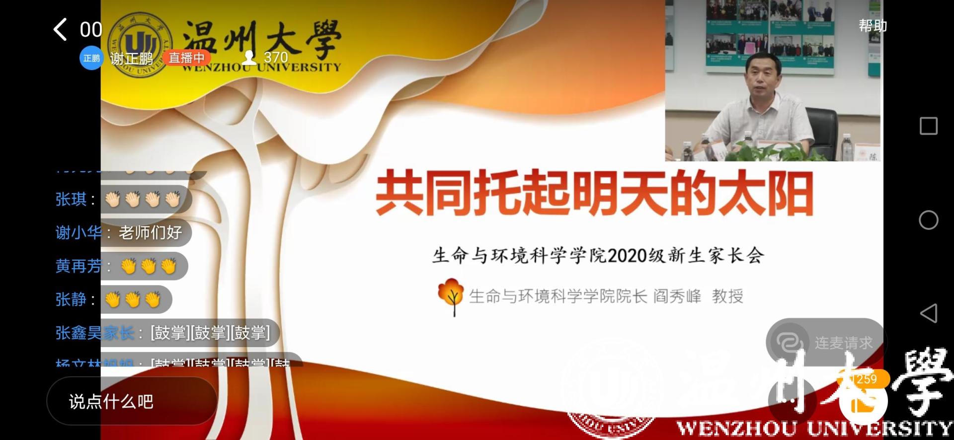 温都讯 “一直以为新生家长会是中小学的专利,没想到大学也有家长会,还是在开学前,真的很期待。”9月22日晚上,beat365官方网站一名2020级新生和家长早早吃了晚饭,在线等待由温大生命与环境科学学院张罗的2020级新生家长“空中”见面会。