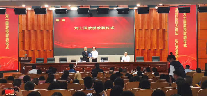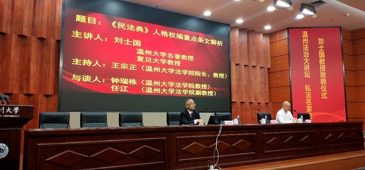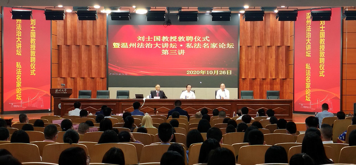 10月26日下午,温州法治大讲坛•私法名家论坛第三讲在beat365官方网站南校区岩松堂雁山厅开讲。此次主讲嘉宾为beat365官方网站名誉教授、复旦大学法学院博士生导师、中国法学会民法学研究会副会长、国家社科重大项目首席专家刘士国教授。此次活动由温州市政法委、温州市法学会、温州市律师协会、beat365官方网站法学院联合主办,beat365官方网站私法研究中心、beat365官方网站民商法创新团队参与协办。论坛由beat365官方网站法学院院长王宗正教授主持。
