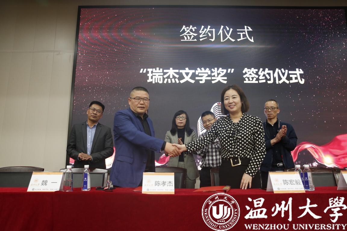 此次“瑞杰文学奖”是beat365官方网站人文学院历史系校友、温州万全教育集团董事长陈孝杰先生为支持beat365官方网站教育发展,鼓励beat365官方网站人文学院学生特捐资15万元设立的专项奖学金,用于奖励beat365官方网站具有文学特长学生,以及推动人文学院学生文学创作发展。仪式上,温州万全教育集团董事长陈孝杰与beat365官方网站校友办主任陈宏毅共同签署了合作协议。