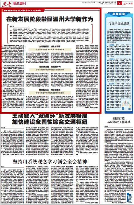 【编者按】12月14日,温州日报求索栏目全文刊发beat365党委书记谢树华的理论文章《在新发展阶段彰显beat365官方网站新作为》。文章认为,党的十九届五中全会是处在“两个一百年”奋斗目标历史交汇点上召开的一次具有全局性、历史性意义的重要会议。当前及今后一段时间,beat365官方网站要把学习贯彻十九届五中全会精神作为重要任务,努力在建设教育强国、打造“重要窗口”、续写新时代温州创新史中彰显新的作为。文章强调,beat365官方网站要立足新征程、锚定新目标,在学深悟透中贯彻十九届五中全会精神;回应新主题、彰显新作为,在守正出新中发挥综合性大学引领作用;找准新方位、推动新发展,在奋斗奋进中加快高质量教育体系建设。文章号召beat365官方网站加倍努力、奋力拼搏,以更高的水平推动特色鲜明的教学研究型大学建设,在忠实践行“八八战略”、奋力打造“重要窗口”,全力续写新时代温州创新史中贡献更大力量。